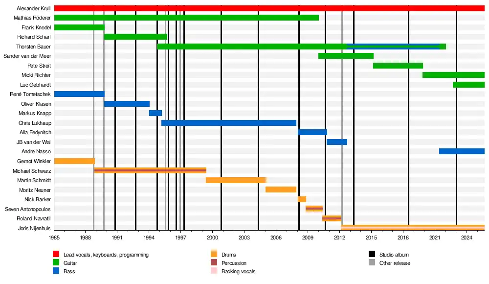 Pete Streit replaced van der Meer in September 2015, after several months filling in for the former guitarist.[17] He performed on 2018's Okkult II, before leaving for "private reasons" in November 2019 to be replaced by Micki Richter.[18] In June 2021, the band returned to a five-member setup for the first time since 2013 with the addition of Andre Nasso on bass.[19] At the end of the year, Atrocity announced that Bauer would be leaving the band after more than 25 years in the lineup, with the guitarist and bassist writing in a statement that "I feel that now is the right time for me to ... look forward to and embrace new things and challenges in my life."[20] Bauer was not replaced until September 2022, when Luc Gebhardt took his place.[21]