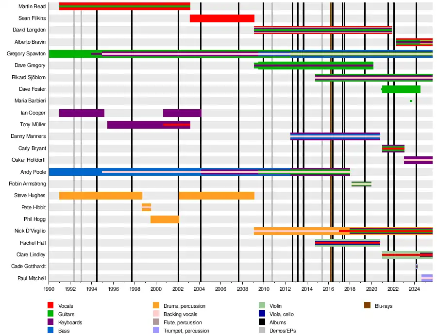 Big Big Train is an English progressive rock band founded in 1990 by Gregory Spawton and Andy Poole. The band's first line-up included Spawton (guitar, keyboards) and Poole (bass), alongside vocalist Martin Read, keyboardist Ian Cooper and drummer Steve Hughes. The band's current line-up includes Spawton (bassist since 2009), drummer, guitarist and keyboardist Nick D'Virgilio (since 2009), guitarist and keyboardist Rikard Sjöblom (since 2014), violinist, keyboardist amd guitarist Clare Lindley (since 2021), vocalist, keyboardist, guitarist and drummer Alberto Bravin (since 2022), keyboardist and vocalist Oskar Holldorff (since 2023) and trumpeter Paul Mitchell (since 2025).