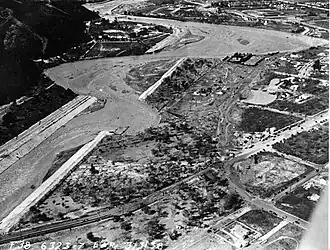 • February–March 1938 – Flood in Los Angeles was caused by two Pacific storms that swept across the Los Angeles Basin in and generated almost one year's worth of precipitation in just a few days. Between 113–115 people were killed by the flooding.[15] The Los Angeles, San Gabriel, and Santa Ana Rivers burst their banks, inundating much of the coastal plain, the San Fernando and San Gabriel Valleys, and the Inland Empire. Flood control structures spared parts of Los Angeles County from destruction, while Orange and Riverside Counties experienced more damage.[15] The flood of 1938 is considered a 50-year flood.[16] It caused $78 million of damage ($1.74 billion in 2024 dollars),[16] making it one of the costliest natural disasters in Los Angeles' history.[17] In response to the floods, the U.S. Army Corps of Engineers and other agencies began to channelize local streams in concrete, and built many new flood control dams and debris basins. These works have been instrumental in protecting Southern California from subsequent flooding events, such as in 1969 and 2005, which both had a larger volume than the 1938 flood.[17]