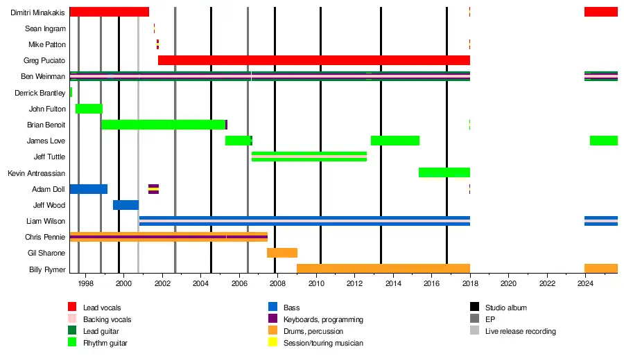 | Patton performed at several shows following the departure of Minakakis, and on Irony Is a Dead Scene (2002).[1] He also made guest appearances at one of the bands final shows in December 2017.[27] |