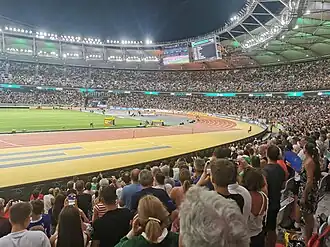 - ^ Stadium capacity is 81,338 for (mostly rugby) football matches with movable lower tier of seating deployed over the athletics track, and ≈75,000 for athletics events with the lower seating tier retracted back under the second tier to reveal the running track.: (Stade de France database entry at StadiumDB.com). Retrieved 20 June 2015.