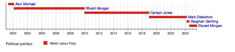 | 6 | | Eluned Morgan, Baroness Morgan of Ely (born 1967) MS for Mid and West Wales | 6 August 2024 | Incumbent | 1 year, 10 days | Labour[a] | E. Morgan Lab (minority) | Huw Irranca-Davies Labour | |||