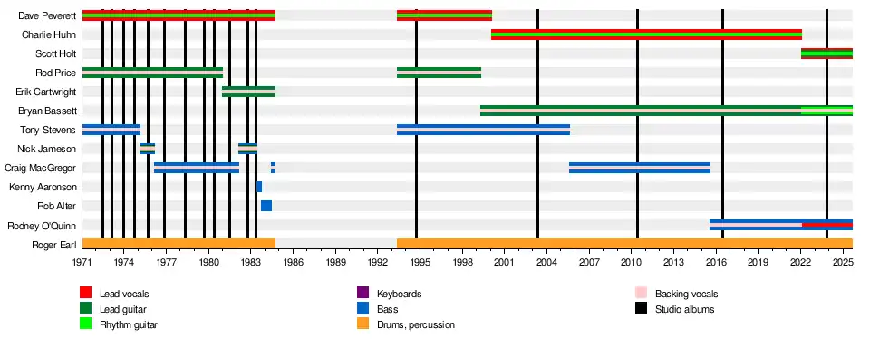 | "Lonesome" Dave Peverett | 1990–1993 (died 2000)[6] |