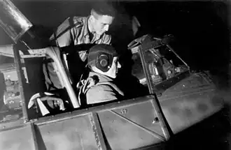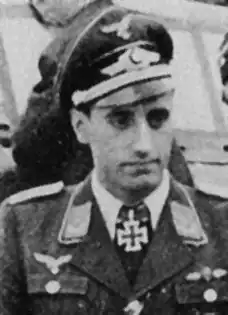 A flying ace or fighter ace is a military aviator credited with shooting down five or more enemy aircraft during aerial combat.[1] German day and night fighter pilots claimed roughly 70,000 aerial victories during World War II, 25,000 over British or American and 45,000 over Soviet flown aircraft. 103 German fighter pilots shot down more than 100 enemy aircraft for a total of roughly 15,400 aerial victories. Roughly a further 360 pilots claimed between 40 and 100 aerial victories for round about 21,000 victories. Another 500 fighter pilots claimed between 20 and 40 victories for a total of 15,000 victories. According to Obermeier, it is relatively certain, that 2,500 German fighter pilots attained ace status, having achieved at least 5 aerial victories.[2] 453 German day and Zerstörer (destroyer) pilots received the Knight's Cross of the Iron Cross. 85 night fighter pilots, including 14 crew members, were awarded the Knight's Cross of the Iron Cross.[3] The list is sorted by the number of aerial victories claimed at night.