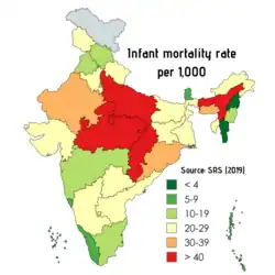 This is a list of Indian states and union territories by infant mortality rates in 2019. The infant mortality rate is the number of deaths of infants under one year old per 1,000 live births. The data is taken from the Sample Registration Survey published by the Indian Ministry of Health.[1] This rate is often used as an indicator of the level of health in a country. According to this national data India's IMR stood at 30 per 1,000 live births in 2019, while according to the UN Inter-agency Group for Child Mortality Estimation it stood at 28 per 1,000 live births.[2]