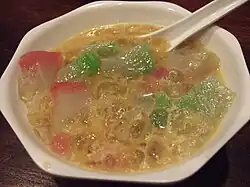 | Wedang angsle | East Java | a hot soupy dessert of coconut milk with sago pearls, glutinous rice and mung beans. | ||