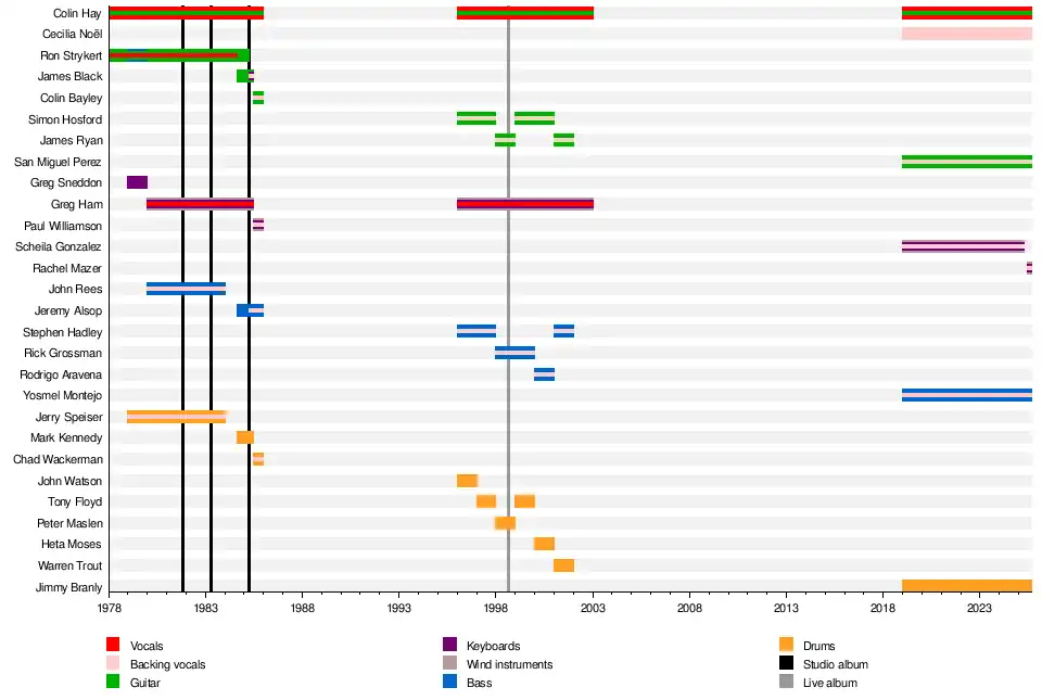 Men at Work is an Australian pop rock band founded in 1978 in St Kilda, Victoria.[1][2][3] The group is best known for several Number 1 singles and studio albums released between 1981 and 1983.[1] The following is a complete chronology of the band's member history.[1][2][3] Although active to this day, Colin Hay has been the only constant member throughout the decades (and also the frontman).