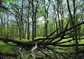 The National Natural Landmarks (NNLs) in Illinois include 18 of the almost 600 such landmarks in the United States. They cover areas of geological, biological and historical importance, and include lakes, bogs, canyons and forests. Several of the sites provide habitat for rare or endangered plant and animal species. The landmarks are located in 13 of the state's 102 counties. Five counties each contain all or part of two or more NNLs, while one landmark is split between two counties. The first designation, Forest of the Wabash in southern Illinois on the Wabash River, was made in 1965, while the most recent designation, Markham Prairie in northern Illinois, was made in 1987.[1] Natural Landmarks in Illinois range from 53 to 6,500 acres (21.4 to 2,630.5 ha; 0.1 to 10.2 sq mi) in size. Owners include private individuals or organizations, and several county, state and federal agencies.[2]