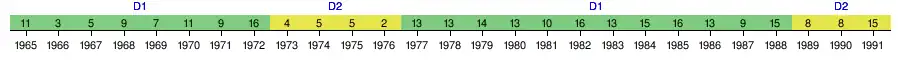 | 1995–96 | 1 | 20 | 11 | 6 | 3 | 42 | 17 | 39 | W | WC | Qual. | |||