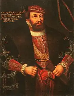 | George II | 30 January 1582 Fourth son of Boguslaus XIII [XI] and Clara of Brunswick-Lüneburg | 7 March 1606 – 27 March 1617 | Duchy of Stettin (at Darłowo only) | Unmarried | 27 March 1617 aged 35 | Children of Bogislaw XIII (XI), divided their inheritance. As happened in the previous generation, each brother received a part of Stettin, and the parts were progressively reunited with each childless brother's death. In 1625 Boguslaus reunited all Pomerania, but as neither he nor his brothers had descendants, Pomerania was annexed by the Kingdom of Sweden by lack of heirs.[15] | |