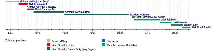 | 5 | | Saddam Hussein صدام حسين (1937–2006) | 1995 2002 | 16 July 1979 | 9 April 2003 (deposed)[5] | 23 years, 267 days | Iraqi Ba'ath Party (Iraq Region) |