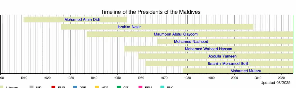 Since 1968, two presidents Ibrahim Nasir and Mohamed Nasheed have resigned from post. When president Nasir resigned in 1978, Maumoon Abdul Gayoom was elected as president on 28 July 1978. In 2012, president Mohamed Nasheed resigned as president following a crisis.[6] Presidents, Mohamed Amin Didi and Mohamed Waheed Hassan Manik served the shortest, Amin from 1 January 1953 to 21 August 1953 and Waheed following the resignation of Nasheed on 7 February 2012 until the inauguration of Abdulla Yameen on 17 November 2013. Maumoon Abdul Gayoom served as president for thirty years, spanning from 1978 to 2008, making him one of the longest serving president in Asia.[7]