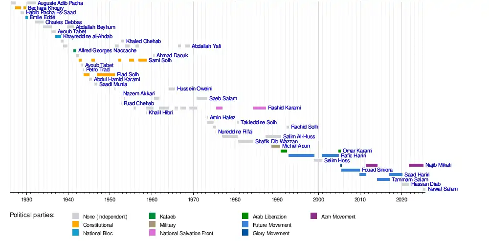 - ^ a b c d e f g h i j k l m n o p q r s t u v w x y z aa ab ac ad ae af ag ah ai aj ak al am an ao ap aq ar as at au av aw ax ay az ba bb bc "الرؤساء السابقون". www.pcm.gov.lb. Retrieved 12 January 2024.