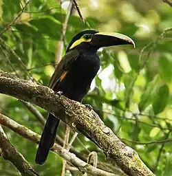 - ^ The IUCN splits the black-throated toucanet sensu lato into two species, the black-billed toucanet (A. cyanolaemus) and black-throated toucanet sensu stricto (A. atrogularis).[2]