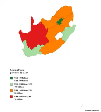 | Rank | Province | GDP (2022; billion ZAR)[1] | GDP (2022; billion US$)[1] | GDP per capita (2022; US$)[1] |