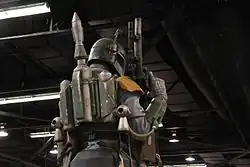Many individual characters are seen or described as using rockets and missiles in the Star Wars universe. The bounty hunter Jango Fett (Temuera Morrison) wears a jet pack which can fire an anti-vehicle homing missile, which he uses against Obi-Wan Kenobi in their duel on Kamino in Attack of the Clones.[19][20] Boba Fett (Jeremy Bulloch) also wears a jet pack which can fire either a homing missile or grappling hook, and carries a wrist-mounted mini concussion rocket launcher which can fire a variety of small homing rockets.[21][22]