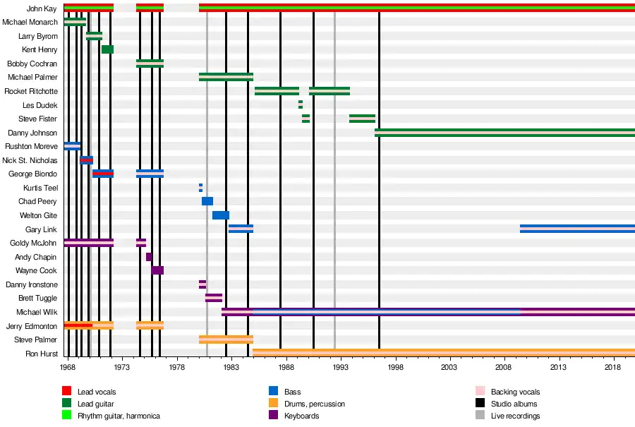 Ritchotte left Steppenwolf in 1989 to tour with the David Lee Roth Band,[18] returning the following year and remaining until late 1993.[17] During his time away from the band, he was replaced briefly by Les Dudek,[19] and later by Steve Fister.[20] Following his departure, Fister returned to Steppenwolf for another three-year run.[21] In 1996, Danny Johnson joined Steppenwolf in place of the departed Fister.[22] Bassist Gary Link rejoined the band in 2009.[23][24] In October 2018, at the end of the band's 50th anniversary tour, Kay announced that the group had officially retired.[25]