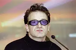 U2 (frontman Bono pictured in 2000) scored their first UK number-one single this year with "Desire", taken from the album Rattle and Hum.