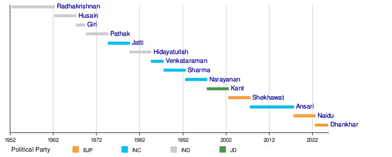 Vice President was a candidate of the Janata Dal (JD) (1) Vice President was an Independent (IND) candidate (5) Vice President was a candidate of the Bharatiya Janata Party (BJP) (3) Vice President was a candidate of the Indian National Congress (INC) (5) |