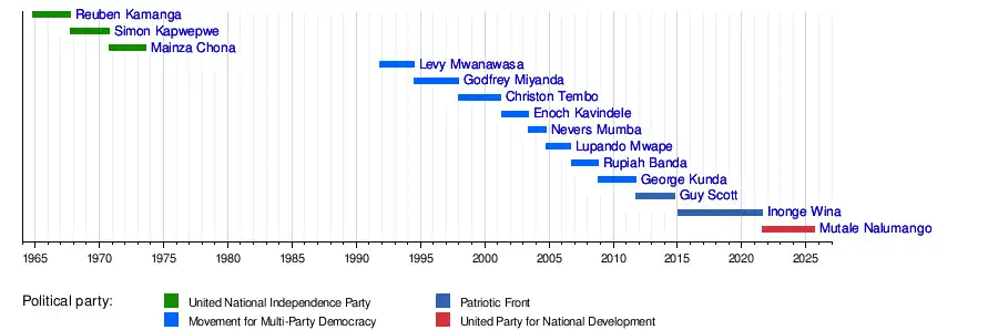 Rupiah Banda became acting president on 19 August 2008 following the death of President Levy Mwanawasa, while Guy Scott became acting president 28 October 2014 following the death of President Michael Sata. Banda was elected president in the subsequent election, and Scott did not stand.