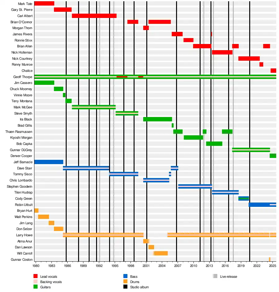 A few months after Courtney's arrival, Vicious Rumors began touring with new bassist Cody Green in place of Hudrap, who had joined Pestilence.[38] In 2020, the band released Celebration Decay, on which bass was performed by Greg Christian. Bassist Robin Utbult became a live member before the album's touring cycle and was confirmed after the recording.[39] In 2022 Ronny Munroe joined as new singer,[40] although he was replaced in August 2023 by the returning Brian Allen who started his third tenure.[41] In May 2024, Howe left the band, he was replaced by Gunnar Coston.[42] The following month DüGrey and Allen also departed.[43] Howe returned in July,[44] alongside new guitarist Denver Cooper.[45] New singer, Chalice (real name Brian Betterton), joined the following month.[46]