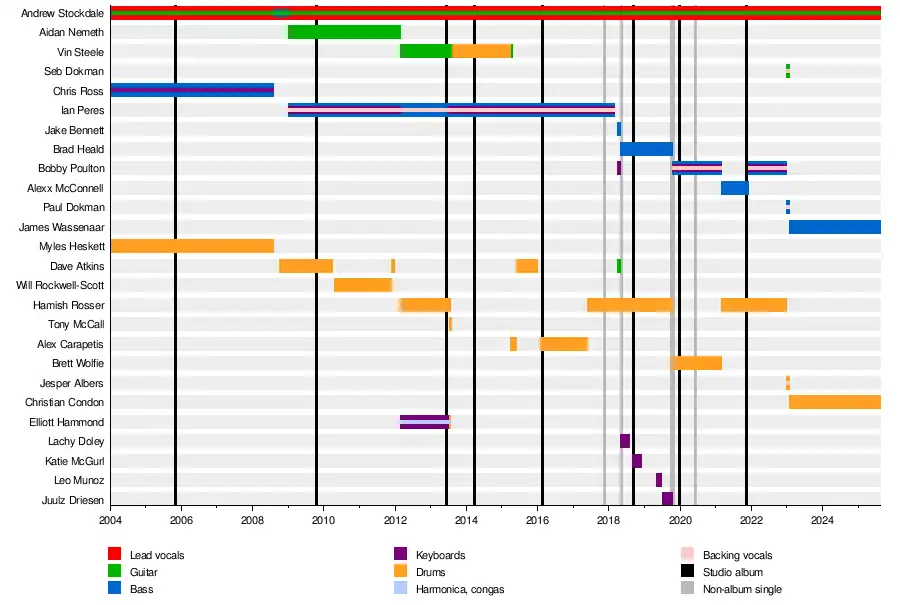 In 2023, the rhythm section was replaced by James Wassenaar (bass) and Christian Condon (drums).[24]
