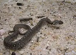 | Vipera latastei[4] | Lataste's viper | | Lt: 50 (70) cm. Broad back of the head and triangular muzzle ending in an upward prominence. Short tail. Its color varies from gray to brown and has a zigzag band running down the back. | | |