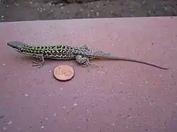 | Timon lepidus[30] | Ocellated lizard NV: (in Spanish, common to all lizards) Legarto/u, regartezón. | | L: 22.5 cm. Lt: 75.5 cm; 59.4 cm (female). It is the largest Iberian lizard. Its layer is yellowish green in males and brownish in females, in both mottled in black. On the sides they have blue ocelli that may or may not be framed in black. Their underside is whitish. Juveniles are usually greenish with white ocelli on the back and sides. | | |