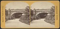 Central Park in New York City has thirty-six ornamental spans, most of which were built in the 1860s as part of the park's construction. No two bridges in the park are alike.[1] There were three types of bridges and arches constructed in Central Park. The spans across the sunken "transverse" roads that carry crosstown traffic below the park were made of natural-looking schist, and are generally not counted as arches or bridges. "Ornamental Bridges or Archways" were larger spans integrated into the greater landscape and were made of brick, stone, or cast iron. The final category, "rustic" bridges, were smaller stone or log bridges and usually spanned small walkways or streams. Central Park had 39 bridges at its peak.