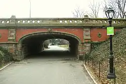 | Dipway Arch | 16 | | near Artisans' Gate at Central Park South and 7th Avenue 40°46.05′0″N 73°58.68′0″W / 40.76750°N 73.97800°W | 1860[54] | South Drive | Pedestrian path | 15 feet 6 inches (4.72 m) | 11 feet 7 inches (3.53 m) | Dipway Arch has curved blue-gray granite, set in ashlar, along the abutments. The vault is lined with red brick and divided into a seven-arched arcade with keystones in each arch.[54][57][58] The span overhead still has its original cast-iron railings.[57] | |