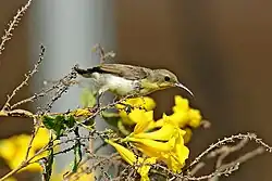 The sunbirds and spiderhunters are very small passerine birds which feed largely on nectar, although they will also take insects, especially when feeding young. Flight is fast and direct on their short wings. Most species can take nectar by hovering like a hummingbird, but usually perch to feed.