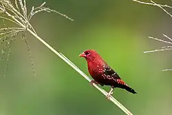 The estrildid finches are small passerine birds of the Old World tropics and Australasia. They are gregarious and often colonial seed eaters with short thick but pointed bills. They are all similar in structure and habits, but have wide variation in plumage colours and patterns.