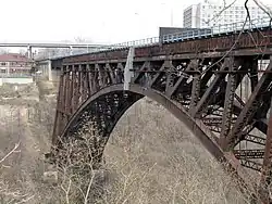 ![]() | 8 | Michigan Central Railway Bridge Out of service since 2001 | 195 m (640 ft) | Arch Steel deck arch | 1925 | Niagara Falls, Ontario– Niagara Falls, New York 43°06′31.4″N 79°03′28.9″W / 43.108722°N 79.058028°W | [S 68] [94] [95] |