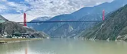 | 55 | Jinsha River Bridge Kahaluo under construction | 卡哈洛金沙江特大桥 | 1,030 m (3,380 ft) | 1,818 m (5,965 ft) | Suspension Steel truss deck, concrete pylons | 2024 | Leibo County–Yongshan County 27°58′13.1″N 103°30′42.7″E / 27.970306°N 103.511861°E | Yunnan | [85] | ||