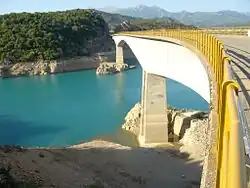 ![]() | 26 | Lake Polyfytos Bridge | Γέφυρα της λίμνης του Πολυφύτου | 100 m (330 ft)(x2) | 1,372 m (4,501 ft) | Box girder Prestressed concrete 71+2x100+71 | 1975 | Neraida–Servia 40°13′57.3″N 21°58′26.2″E / 40.232583°N 21.973944°E | Western Macedonia | [S 28] [41] |