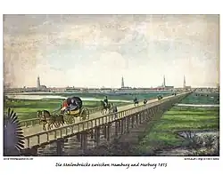 Up until the 19th century, the Unterelbe had no fixed crossing. Travel time between Hamburg and Harburg took over two hours, and included two ferry trips across the Norder- and Süderelbe and a weary trip across the dikes of Wilhelmsburg. During Napoleon's brief annexion of Hamburg, a 4 kilometers (2.5 miles) long pile bridge was built across the islands of Wilhelmsburg, however it also required cable ferries across the Elbe's two anabranches. In 1817 the poorly maintained structure was washed away.
