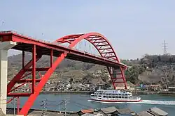 ![]() | 48 | Second Ondo Bridge | 音戸大橋 | 280 m (920 ft) | 492 m (1,614 ft) | Arch Steel through arch | 2013 | Kure - Kurahashi-jima 34°11′53.3″N 132°32′19.9″E / 34.198139°N 132.538861°E | Hiroshima | [36] | |