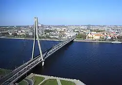 ![]() | 1 | Vanšu Bridge | Vanšu tilts | 312 m (1,024 ft) | 595 m (1,952 ft) | Cable-stayed Steel box girder deck, concrete pylon | 1981 | Riga–Ķīpsala 56°57′4″N 24°5′42″E / 56.95111°N 24.09500°E | Vidzeme | [S 5] | |