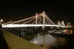 | Albert Bridge | Combined Ordish–Lefeuvre / suspension / beam | 1873 | Kensington and Chelsea: Chelsea | Wandsworth: Battersea | Kensington and Chelsea London Borough Council | |