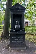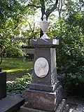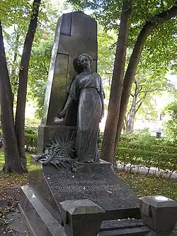 Over time the cemetery became a popular and prestigious burial ground for those of many areas of society. The wealthy merchant A.I. Kosikovsky was buried under a monumental sarcophagus on a high pedestal surmounted by a canopy on eight fluted columns.[4] Opposite it stood a similarly grand monument to the statesman Pavel Demidov, which has since been lost.[4] In 1857 the remains of the composer Mikhail Glinka were returned from Berlin and buried in the cemetery, with a grand monument erected two years later to the design of architect I. I. Gornostayev, with sculptures by Nikolay Laveretsky.[4][9] On 1 February 1881 the author Fyodor Dostoevsky was buried in the cemetery, with a similarly large monument.[4][10] During the 1880s composers Modest Mussorgsky and Alexander Borodin were buried in the northern part of the grounds, with Pyotr Ilyich Tchaikovsky following in 1891.[4][11][12][13]
