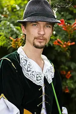 Julian Alfred Pankratz, Viscount of Lettenhove, commonly known as Dandelion (Polish: Jaskier), is a poet, minstrel, bard, and Geralt's best friend. The Polish word jaskier actually refers to the buttercup (Ranunculus). Some of his more famous ballads are about the relationship between Geralt and Yennefer, but none of Jaskier's ballads appear in the book. Some excerpts of these are cited from Jaskier's memoirs 50 lat poezji (50 Years of Poetry).[17] By the time of the saga, Dandelion is around 40 years old. However, it is said that he looked like he was in his 30s ("You are almost 40, you look 30, you imagine you're 20, and you act like you're 10" as noted by Dijkstra). Also, in Chapter 3 of The Tower of the Swallow Geralt criticizes Jaskier's selection of the title 50 Years of Poetry and says that he (Jaskier) is not yet forty and that he started writing poetry only at the age of 19 inspired by the passion towards the Countess de Stael.[18] He wears a fancy cap with a heron's feather and plays an elven lute.[17] Dandelion accompanies Geralt in many novels and ends up joining Geralt's party while searching for Ciri but leaves it before the assault on Stygga Castle. Dandelion makes Geralt promise he would return with Ciri to the Duchy of Toussaint where Dandelion lives. He would later rejoin Geralt and witness his and Yennefer's death in the kingdom of Rivia.