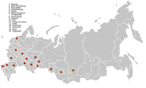 Cities in grey are in areas annexed by Russia that the international community considers illegally occupied by Russia.[1] Only a few nations recognize Crimea, the Donetsk People's Republic, Kherson Oblast, Luhansk People's Republic, and Zaporozhye Oblast as part of Russia.[2]