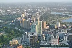 Five cities in Australia currently host at least one skyscraper – all of which are state capitals, with the exception of the Gold Coast, a city in the state of Queensland. Of Australian cities which comprise skyscrapers, Sydney constructed the first skyscraper in the country in 1967,[1] followed by Melbourne in 1972,[2] Brisbane and Perth in 1988,[3][4] and most recently, the Gold Coast in 2004.[5] Most skyscrapers in Australia are concentrated in the Eastern states (Queensland, New South Wales, and Victoria), whilst a smaller number are located in the Western Australia state capital, Perth. The cities with the highest number of skyscrapers have traditionally been either Sydney or Melbourne since the 1970s.[6][7][8] The only other capital cities in Australia to not feature any skyscrapers whatsoever are Adelaide in South Australia, Hobart in Tasmania, Darwin in the Northern Territory, and Australia's capital, Canberra in the Australian Capital Territory.