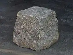 A sett block, sometimes mistakenly referred to as a cobble, but distinguished by being quarried & carved rather than naturally occurring, and being of regular size and rectangular shape.