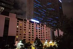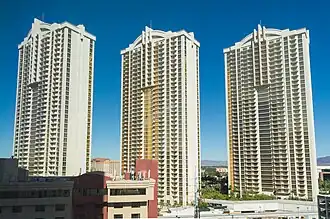 Panorama Towers was announced in September 2003,[115] and began construction the following year.[116] The first tower was opened in 2006,[117] followed by a second tower in 2007.[118] Both towers stand 33 stories high,[119][120] and were built at an estimated cost of $300 million.[117] A third tower, standing 45 stories, was renamed as The Martin in 2011,[121] and received a $3 million renovation to increase sales.[122] The complex is located west of Interstate 15 and CityCenter.