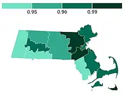 This is a list of Massachusetts counties by Human development index (HDI) for the year 2024. Nantucket County ranks highest with an HDI of 1.007, driven by the highest life expectancy, the highest per capita income, and one of the highest education indices in the state. Closely following are Norfolk and Middlesex counties, each with an HDI exceeding 0.990. At the lower end, Hampden, Bristol, and Berkshire counties have the lowest human development indices, all falling below 0.950. The overall HDI for Massachusetts stands at 0.956, the highest among all states in the United States.[1][2][3]