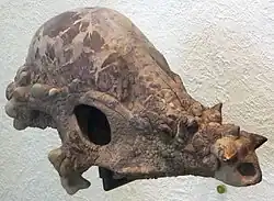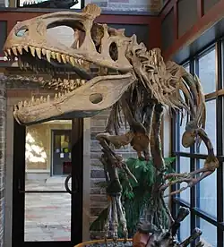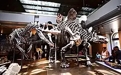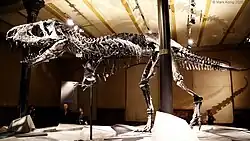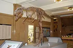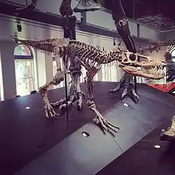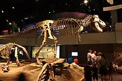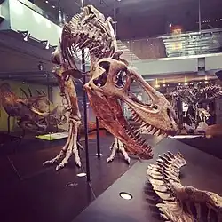 Type of Exhibit Taxon Catalogue Number Nickname Exhibiting Institution City State Country Notes Image Skeleton, mounted Acrocanthosaurus atokensis NCSM 14345 Fran North Carolina Museum of Natural Sciences Raleigh North Carolina USA Skeleton, mounted (copy) Acrocanthosaurus atokensis NCSM 14345 (copy) Houston Museum of Natural Science Houston Texas USA Skull Albertosaurus sarcophagus TMP 1985 098 0001 Royal Tyrrell Museum Drumheller Alberta Canada Skeleton, mounted Allosaurus fragilis AMNH 5753 American Museum of Natural History New York New York USA Skeleton, mounted Allosaurus fragilis CM 11844 Carnegie Museum of Natural History Pittsburgh Pennsylvania USA Skeleton, mounted Allosaurus fragilis DMNS 2249 Denver Museum of Nature and Science Denver Colorado USA Skeleton, mounted Allosaurus fragilis LACM 46030 Natural History Museum of Los Angeles County Los Angeles California USA Skeleton, mounted (copy) Allosaurus jimmadseni MOR 693 (copy) Big Al (copy) Museum of the Rockies Bozeman Montana USA Skeleton, mounted (copy) Allosaurus jimmadseni SMA 0005 (copy) Big Al 2 (copy) Houston Museum of Natural Science Houston Texas USA Skeleton, mounted Anchiceratops NMC 8547 (body), NMC 8535 (copy of skull) Canadian Museum of Nature Ottawa Ontario Might represent a separate taxon Partial skull Anchiceratops ornatus FMNH P15003 Field Museum of Natural History Chicago Illinois USA Partial skull Anchiceratops ornatus ROM 802 Royal Ontario Museum Toronto Ontario Canada Skull Anchiceratops ornatus TMP 1983.001.0001 Royal Tyrrell Museum Drumheller Alberta Canada Skeleton, mounted Apatosaurus AMNH 460 American Museum of Natural History New York New York USA Skeleton, mounted Apatosaurus louisae CM 3018 Carnegie Museum of Natural History Pittsburgh Pennsylvania USA Skeleton, mounted Apatosaurus FMNH P25112/FMNH P27021 Field Museum of Natural History Chicago Illinois USA May represent a novel species within Apatosaurus Skeleton, mounted (copy) Barosaurus lentus AMNH 6341 (copy) American Museum of Natural History New York New York USA Skeletal elements, unmounted Brachiosaurus altithorax FMNH P 25107 Field Museum of Natural History Chicago Illinois USA Holotype specimen Skeleton, mounted (copy) Brachiosaurus altithorax FMNH P 25107 (copy) Field Museum of Natural History Chicago Illinois USA Cast of the holotype specimen Skeleton, mounted (copy) Brachiosaurus altithorax FMNH P 25107 (copy) O'Hare International Airport Chicago Illinois USA Cast of the holotype specimen Skeleton, mounted Brontosaurus excelsus YPM 1980 Peabody Museum of Natural History New Haven Connecticut USA Holotype specimen Skeleton, panel mounted Camarasaurus lentus CM 11338 Carnegie Museum of Natural History Pittsburgh Pennsylvania USA Skeleton, mounted Camptosaurus aphanoecetes CM 11337 Carnegie Museum of Natural History Pittsburgh Pennsylvania USA Skull Centrosaurus apertus AMNH 5427 American Museum of Natural History New York New York USA Skull Centrosaurus apertus ROM 767 Royal Ontario Museum Toronto Ontario Canada Skeleton, mounted Chasmosaurus belli ROM 843 Royal Ontario Museum Toronto Ontario Canada Skeleton, mounted Corythosaurus casuarius CM 5856 Carnegie Museum of Natural History Pittsburgh Pennsylvania USA Skull Cryolophosaurus ellioti FMNH PR1821 (copy) Field Museum of Natural History Chicago Illinois USA Real skull in collections Skeleton, mounted (copy) Cryolophosaurus ellioti FMNH PR1821 (copy) Fryxell Geology Museum Rock Island Illinois USA Skeleton, mounted (copy) Cryolophosaurus ellioti FMNH PR1821 (copy) Orton Geological Museum Columbus Ohio USA Skull Daspletosaurus horneri MOR 590 Museum of the Rockies Bozeman Montana USA Holotype specimen Skeleton, mounted Daspletosaurus torosus CMN 8506 Canadian Museum of Nature Ottawa Ontario Canada Holotype specimen Skeleton, mounted Daspletosaurus FMNH PR308 Gorgeous George Field Museum of Natural History Chicago Illinois USA Originally assigned to Gorgosaurus Skeleton, mounted Diplodocus carnegiei CM 84 Dippy Carnegie Museum of Natural History Pittsburgh Pennsylvania USA Holotype specimen Skeleton, mounted Diplodocus longus DMNH 1494 Denver Museum of Nature and Science Denver Colorado USA Skeleton, mounted Dracorex hogwartsia TCMI 2004.17.1 The Children's Museum of Indianapolis Indianapolis Indiana USA Skeleton, mounted Dryosaurus elderae CM 3392 Carnegie Museum of Natural History Pittsburgh Pennsylvania USA Model Dryptosaurus aquilunguis Bess Bower Dunn Museum Libertyville , Illinois USA Skeleton, mounted Edmontonia rugosidens AMNH 5665 American Museum of Natural History New York New York USA Skeleton, mounted Edmontosaurus annectens AMNH 5730 and AMNH 5886 American Museum of Natural History New York New York USA Fossil mummy Edmontosaurus annectens AMNH 5060 Trachodon mummy American Museum of Natural History New York New York USA Skull Edmontosaurus annectens LACM 23502 Natural History Museum of Los Angeles County Los Angeles California USA Skeleton Edmontosaurus annectens YPM 2182 Peabody Museum of Natural History New Haven Connecticut USA Skeleton Gorgosaurus libratus AMNH 5458 American Museum of Natural History New York New York USA Skeleton Gorgosaurus libratus USNM 12814 National Museum of Natural History Washington D.C. USA formerly AMNH 5428 Skeleton Gorgosaurus libratus TMP 91.36.500 Royal Tyrrell Museum of Palaeontology Drumheller Alberta Canada Sub-adult specimen Skeleton Gorgosaurus sternbergi AMNH 5664 American Museum of Natural History New York New York USA now recognized as a juvenile Gorgosaurus libratus Skull Lambeosaurus lambei AMNH 5353 American Museum of Natural History New York New York USA Skeleton Lambeosaurus lambei FMNH PR 380 (body) UC 1479 (head)