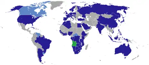- ^ a b c d e f g h i j k l m n o p q r s t u v w x y z aa ab ac ad ae af ag ah ai aj ak al am an ao ap aq ar as at au av aw ax ay az ba bb bc bd be bf bg bh bi bj bk bl bm bn bo "Rede Diplomática" [Diplomatic Network]. Ministry of Foreign Affairs of Angola (in Portuguese). Retrieved 10 October 2024.