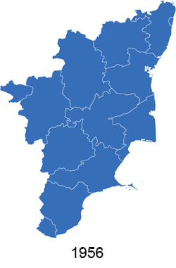 As a result of the re-organization of states in 1956, South Canara and Bellary districts were merged with Mysore State, which became Karnataka and the Malabar district was added to the State of Travancore-Cochin to form Kerala. The Tamil speaking regions of Kanyakumari, which were earlier part of Travancore-Cochin, were merged to the Madras State.[6] After the reorganisation, the Madras state had 13 districts namely: Chingleput, Coimbatore, Kanyakumari, Madras, Madurai, Nilgiris, North Arcot, Ramanathapuram, Salem, South Arcot, Thanjavur, Tiruchirappalli and Tirunelveli.[7]