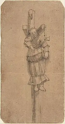 ![]() | Elsje Christiaens Hanging on a Gibbet (side view) | 1664 | Pen and brown ink, brush and grayish brown wash on heavy brownish paper | 15.8 x 8.0 cm | Metropolitan Museum of Art, New York |